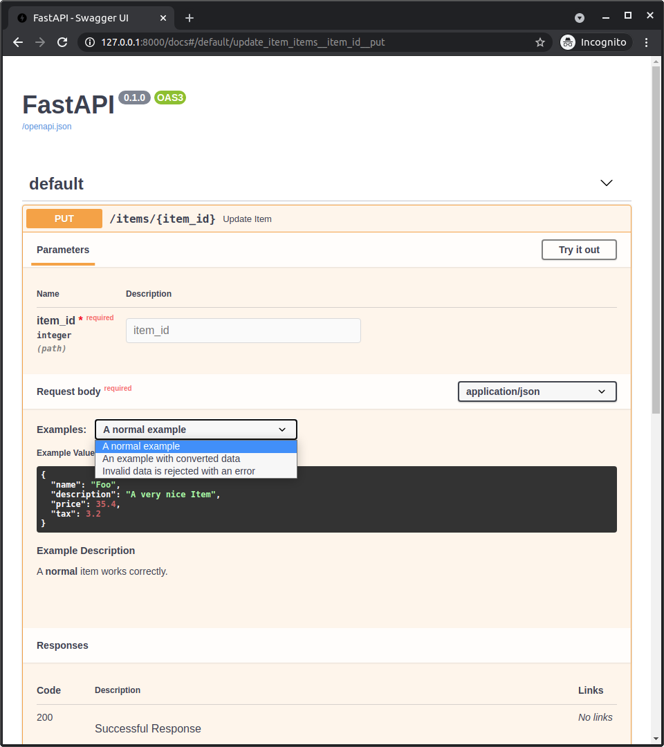 Nevertheless, at the time of writing this, Swagger UI, the tool in charge of showing the docs UI, doesn't support showing multiple examples for the data in JSON Schema. But read below for a workaround.